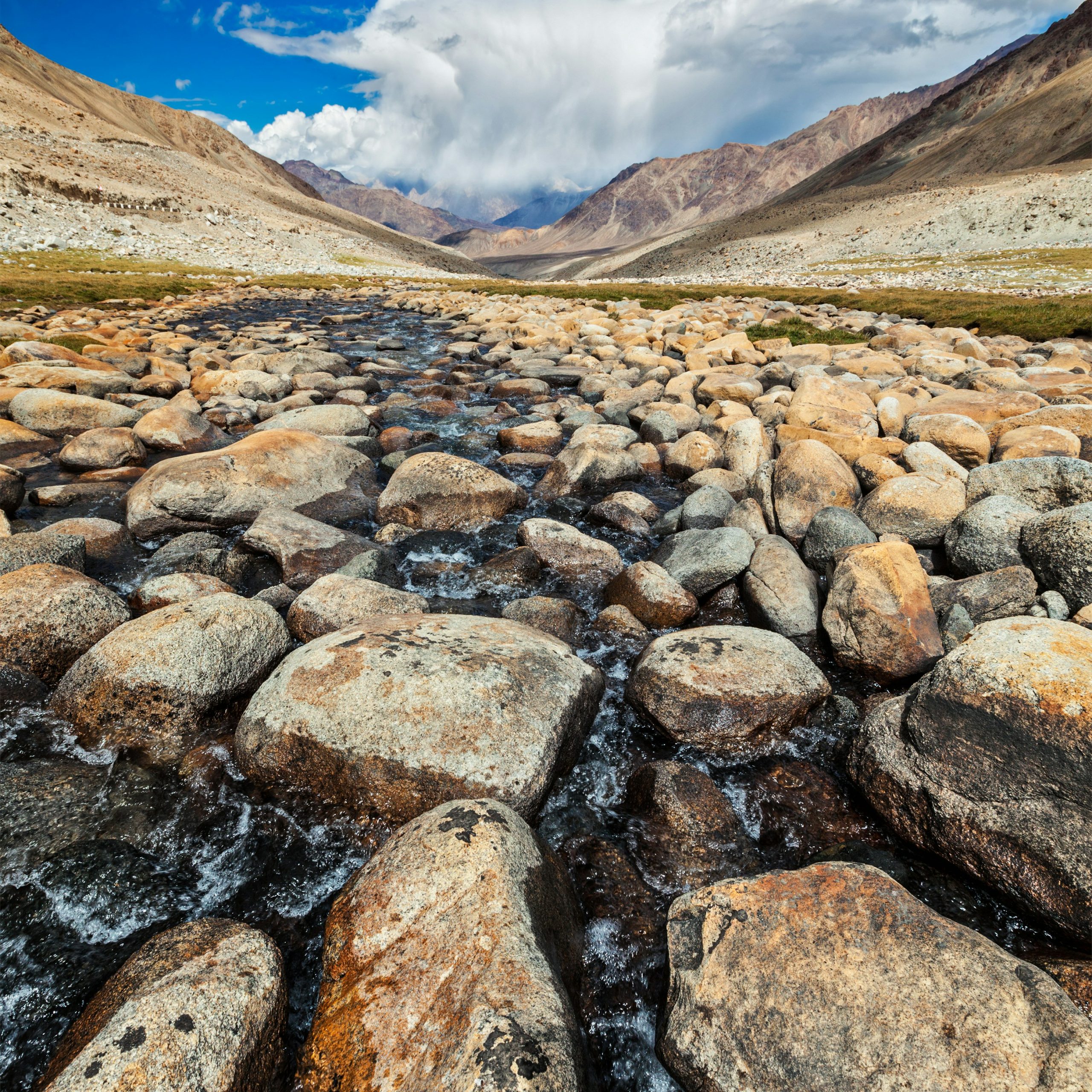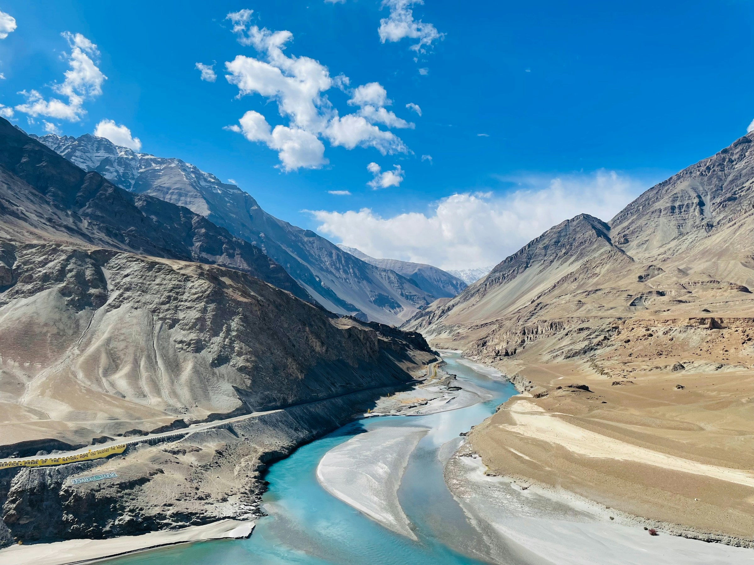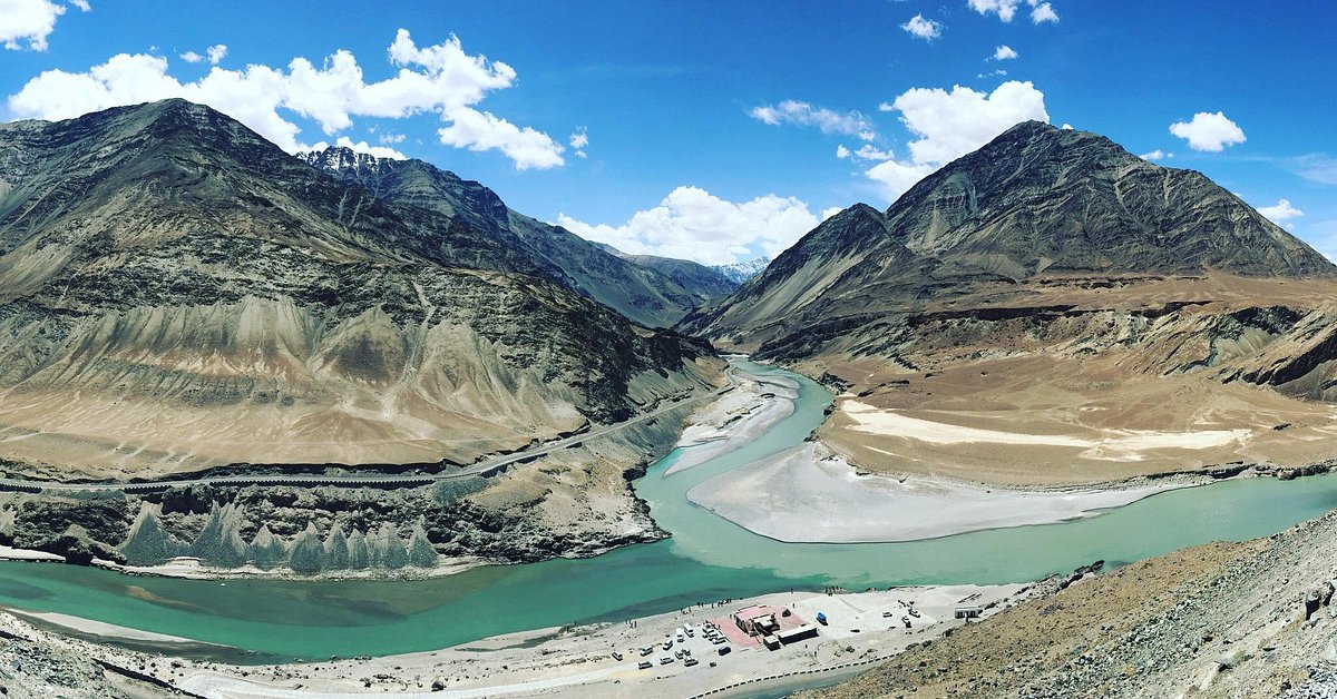 End the journey at the striking confluence of the Indus and Zanskar Rivers, where turquoise and muddy brown currents swirl together before flowing on forward.